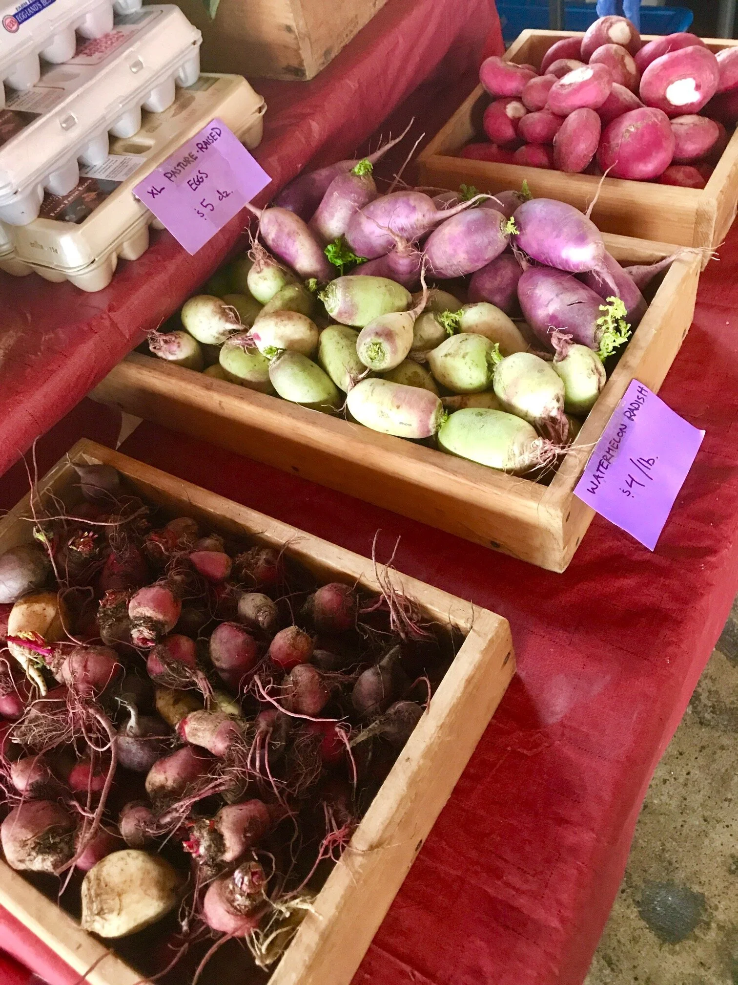 Collards, beets, watermelon radish, daikons, assorted turnips, bacon, baby back ribs, shoulder roasts, boneless loin roasts, Porterhouse chops, pork belly, shanks, FRESH XL BROWN EGGS, ground beef, and Pekin duck. Also pork HOT DOGS back in stock!